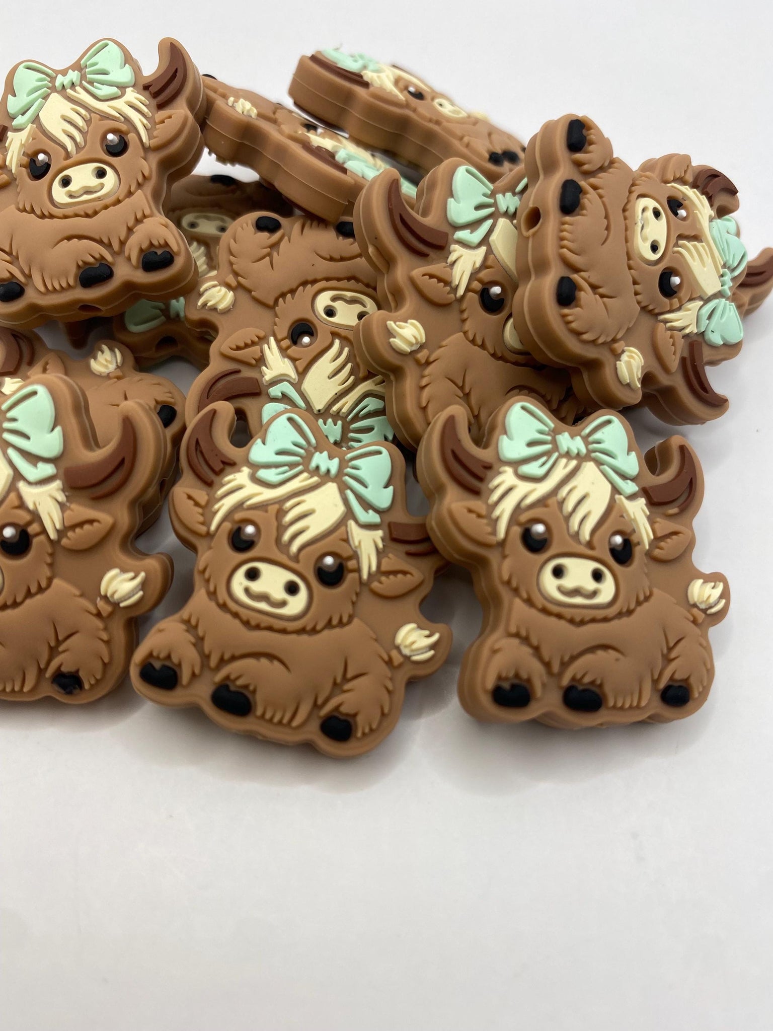 1 highland cow with mint green bow silicone focal beadmake keychains, wristlets, pens, cup charms etc..